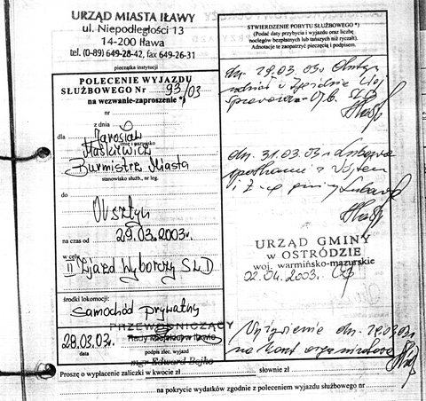 Jedna z wielu delegacji Jarosława Maśkiewicza. Tu cel podróży: zjazd wyborczy SLD w Olsztynie, gdzie Maśkiewicz wystąpił nie jako burmistrz, ale jako delegat partii! Mało tego: w rubryce po prawej stronie sam Maśkiewicz wpisał, że był nie tylko w Olsztynie, ale i dwa dni później w Lubawie. Nie potwierdzają tego pieczęcie instytucji docelowych. Za to obok znalazła się jeszcze pieczęć... Urzędu Gminy w Ostródzie! Efekt: Maśkiewicz przy pomocy jednego druku zainkasował gotówkę za trzy wyjazdy! Czy te podróże przyniosły korzyść miastu, czy tylko burmistrzowi – wie tylko on.